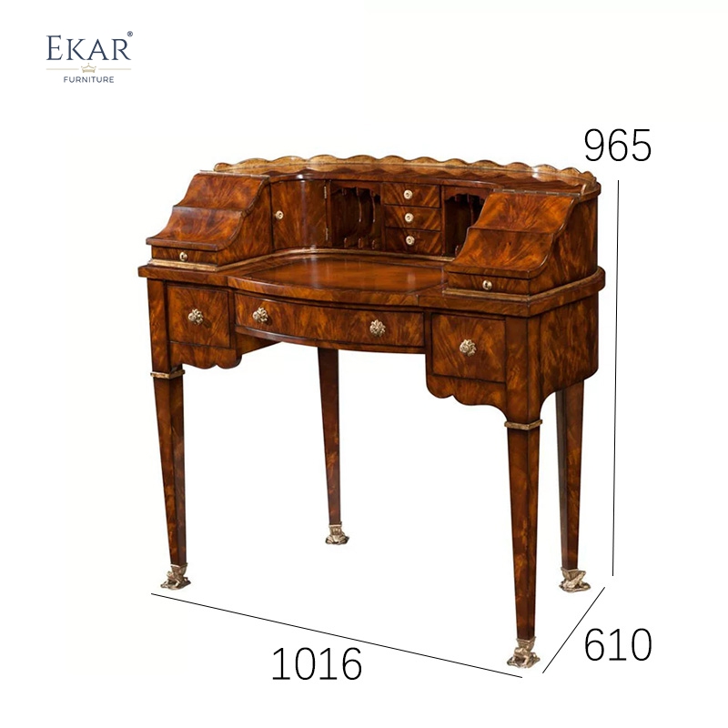 Reliability meets high art in the structural engineering of the desk’s framework. The unit is supported by four slender, tapered legs that transition into ornate brass-tipped feet, providing a stable yet light silhouette that ensures the piece remains a timeless staple of your interior landscape. Utilizing high-grade solid hardwoods for the primary structure, our Foshan export furniture factory employs traditional joinery techniques to guarantee structural permanence and heirloom quality. The edges are accented with delicate gold-leaf beading and ornate floral pulls that serve as the "jewelry" of the facade. This meticulous attention to structural integrity is what allows EKAR FURNITURE to stand out as a global leader, providing furniture that withstands diverse climates while gaining character and value over generations.