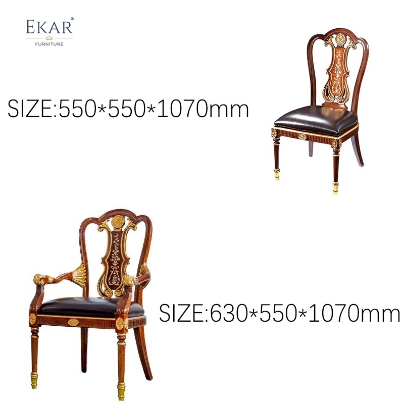 Reliability meets high art in the structural engineering of the chair’s framework. The unit is supported by slender, tapered front legs that transition into elegant block shoulders adorned with hand-carved floral medallions, all highlighted with shimmering gold leaf. Utilizing traditional joinery techniques, our Foshan customized furniture factory ensures structural permanence and heirloom quality in every joint. The high-gloss, multi-layer finish not only protects the delicate wood grain but also enhances the natural depth of the timber, creating a luminous surface that radiates professional-grade durability. This meticulous attention to structural integrity is what allows EKAR FURNITURE to stand out as a global leader, providing customized furniture that withstands diverse climates while gaining character and value over generations.