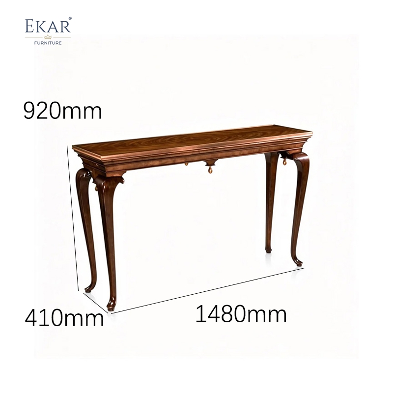 A Timeless Statement for Sophisticated Entryways The first impression of a home starts at the threshold, and the Alexander Noble Heritage Console Table by EKAR FURNITURE is designed to make that moment truly unforgettable. This piece is a sophisticated tribute to British classical design, characterized by its long, slender profile and fluid architectural lines. The tabletop features a stunning book-matched veneer that highlights the natural beauty and depth of premium hardwoods, creating a warm and inviting atmosphere. As a premier high-end furniture customization factory, we focus on silhouettes that provide a sense of history while fitting perfectly into modern luxury floor plans. Whether placed in a grand foyer or a narrow urban corridor, this console brings a regal yet understated presence that defines the character of the entire home.