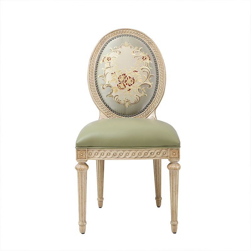 The EKAR Genevieve Estate Dining Chair is a masterful reinterpretation of the Louis XVI aesthetic, adapted for the scale and comfort of the modern American estate home. This chair is not merely a seat; it is a piece of art designed to elevate the dining experience to a level of aristocratic refinement. The silhouette is defined by its classic oval backrest, a hallmark of Neoclassical design that conveys elegance and grace. Finished in a sophisticated whitewash or antique cream glaze, the solid wood frame brings a light, airy feel to the dining room, making it perfect for both formal evening dinners and sunlit brunches. It appeals to the homeowner who values the romance of history and seeks to create a dining space that is both impressive and inviting.