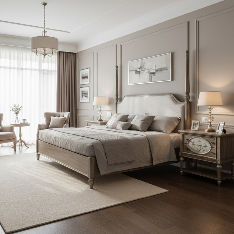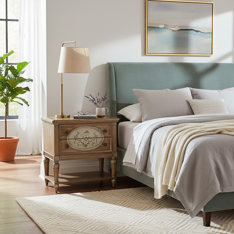 In terms of application, this versatile English-inspired nightstand is specifically curated for grand manor master chambers, high-concept boutique hotel suites, and upscale residential villas. Its unique profile and neutral weathered textures allow it to harmonize with a variety of décor themes, from traditional British manors to more "New Classic" metropolitan interiors. Because of its elegant proportions and multi-tonal wood palette, it is frequently featured as India imported furniture in luxury estates that require a touch of historical gravity and professional poise. It pairs naturally with high-backed upholstered beds, large-scale velvet area rugs, and ornate crystal lighting to create a fully immersive luxury environment that reflects a refined taste for global excellence.