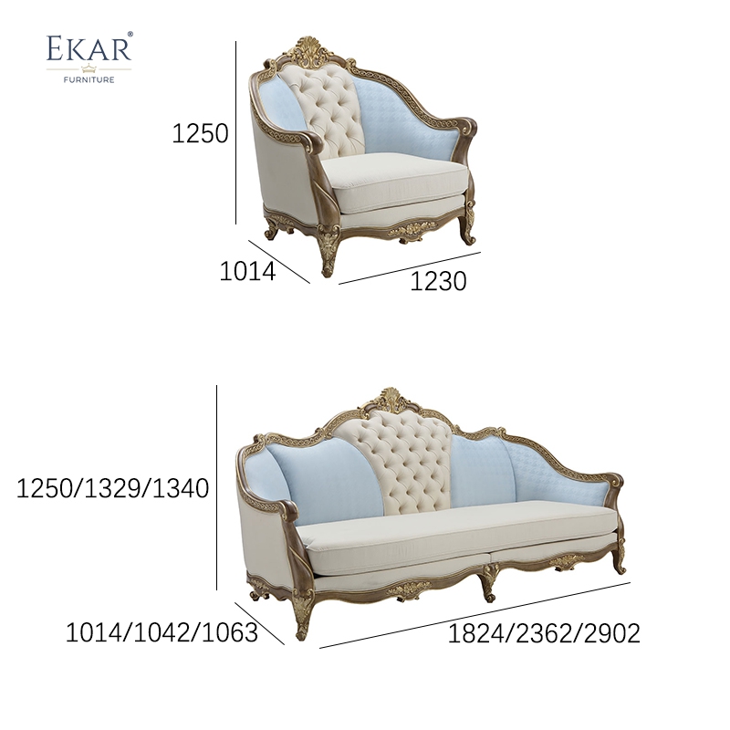 Integrating the EKAR Isabelle Sofa into your home is an exercise in creating a cohesive, high-end atmosphere. It is designed to define the character of a formal living room or a dedicated conversation area. Its ornate detailing and light palette make it an excellent candidate for floating in the center of a room, where its beautiful back and sides can be admired. It pairs exceptionally well with glass-top coffee tables that allow the sofa’s carved legs to remain visible, or with antique rugs that echo its traditional lineage. Whether placed against a wall with decorative molding or positioned to face a grand fireplace, this sofa commands respect. It bridges the gap between a museum-quality antique and a functional piece of modern upholstery, offering durability and style that will remain timeless as trends come and go. With EKAR, you are investing in a legacy of beauty