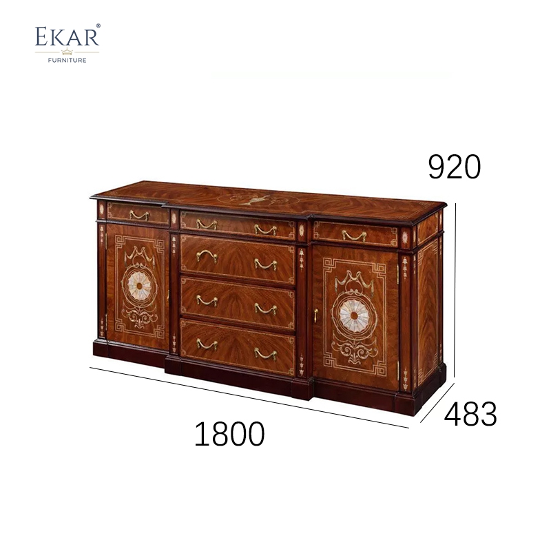 Artisanal excellence is visible in every millimeter of the hand-crafted framework, showcasing the complex material layering and surface design of our Foshan customized furniture factory. The door panels and drawer fronts are adorned with rare "flame" mahogany veneers, showcasing a multi-dimensional grain that radiates a deep, honeyed warmth. Master artisans at our Foshan export furniture factory meticulously hand-select and book-match every veneer sheet to ensure a visually symmetrical and opulent finish. The panels are further enhanced by intricate hand-inlaid motifs, including classical sunburst medallions and geometric borders executed in contrasting lighter timbers. This level of material excellence is why our collections are a primary choice for the India imported furniture sector and among prestigious interior designers seeking "one-of-a-kind" quality for their highest-profile customized furniture projects.