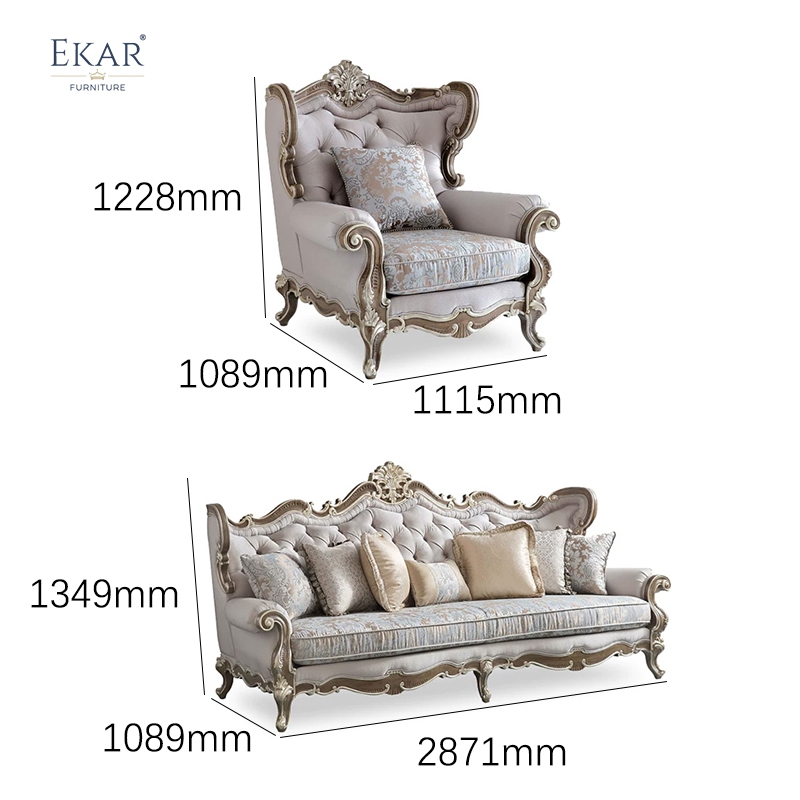 The EKAR Renaissance Imperial Grand Sofa represents a monumental definitive statement in American classical design, meticulously engineered by EKAR FURNITURE to serve as the structural and aesthetic anchor for the world’s most prestigious living environments. As a leading mid-to-high-end furniture customization factory, we have designed this piece to capture the architectural poise and historical dignity of the grand Victorian and Federal eras. The silhouette is defined by its majestic "camelback" curve that flows effortlessly from the central hand-carved floral crest down to the gracefully rolled armrests. This isn't just a sofa; it is a structural masterpiece for your home, reflecting the superior woodworking expertise and aesthetic depth that only a top-tier Foshan furniture factory can provide to the international luxury market.