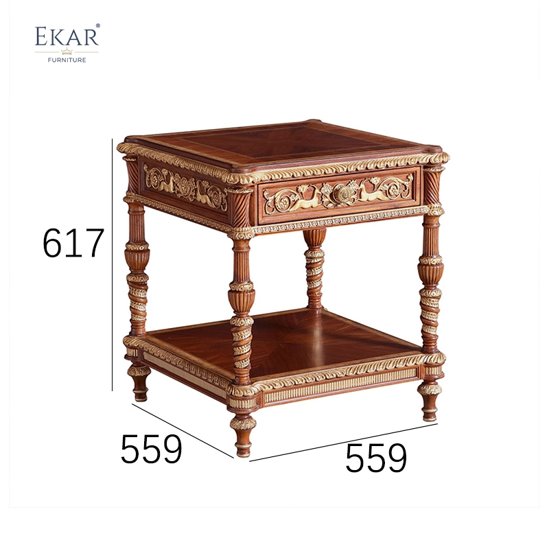 Complete your living room with the EKAR Royal Sovereign End Table. Featuring intricate hand-carved details, antique gold leaf accents, and a functional storage drawer, this square side table epitomizes luxury traditional furniture.
