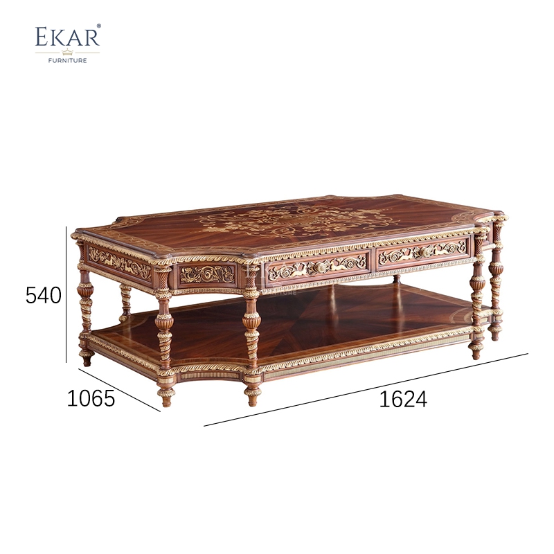 While the EKAR Royal Sovereign is a triumph of decorative art, it is also engineered for practical living. The table features two discreet, integrated drawers within the apron, providing essential storage for remote controls, coasters, or reading glasses, keeping the tabletop clutter-free. The drawer fronts are seamlessly incorporated into the carved design, maintaining the aesthetic flow. Below, a spacious lower shelf mirrors the shape of the tabletop. This shelf features a beautiful starburst veneer pattern of its own, offering a dedicated stage for displaying coffee table books, decorative bowls, or collectibles. This dual-level design not only maximizes the utility of the coffee table but also adds structural stability, ensuring the piece remains rock-steady during use.