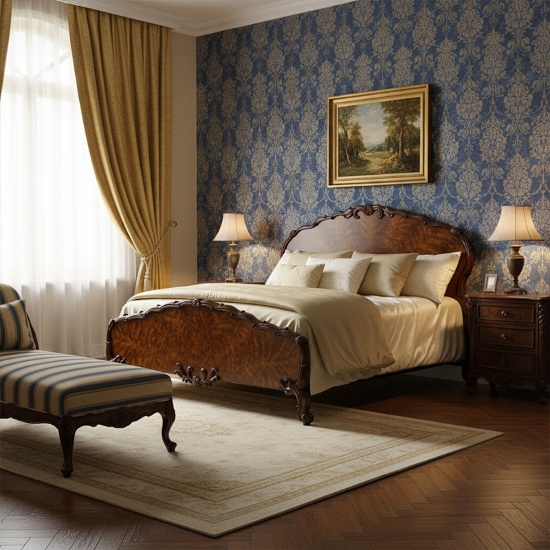 When it comes to application, this bed is built for grand master suites, luxury villas, and high-concept boutique hotel rooms. It pairs perfectly with heavy silk drapery, ornate chandeliers, and classic nightstands to create a fully immersive "Old World" sanctuary. Because of its neutral but rich color palette, it harmonizes beautifully with everything from deep mahogany floors to light, airy neoclassical wall moldings. For interior designers looking for premium export furniture, this bed provides a versatile but dominant focal point that works exceptionally well in large-scale rooms where its grand proportions can be fully appreciated and celebrated.