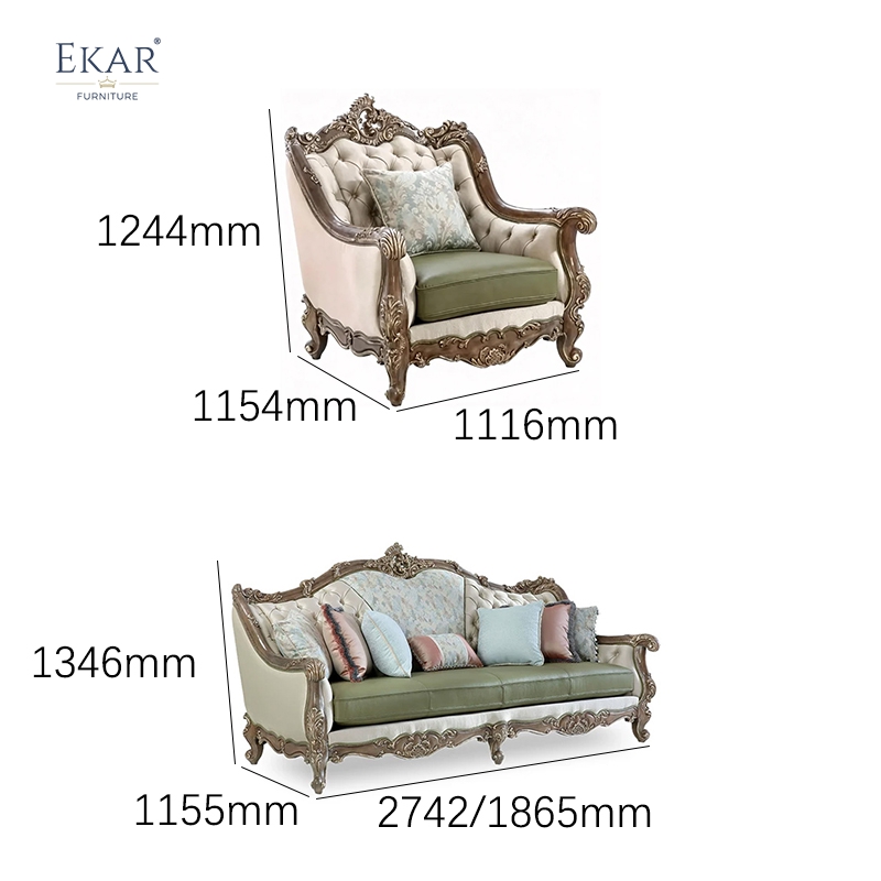 The seating experience is defined by a pursuit of absolute sensory luxury and restorative comfort, designed to facilitate hours of sophisticated social interaction. The backrest is adorned with meticulous diamond button tufting, a hallmark of classical seating that adds significant tactile depth and visual complexity to the piece. As a premier Foshan export furniture factory, we ensure that the cushioning utilizes high-density, multi-layered resilient foam systems, guaranteeing the sofa maintains its majestic shape through years of frequent use. The unique upholstery scheme features a premium sage-green leather seat—providing a cooling, durable contrast—paired with an ivory-toned damask fabric backrest featuring shimmering floral patterns. This combination of soft, high-quality textiles and ornate wood profiles makes it a standout choice for those who demand the pinnacle of global export furniture.