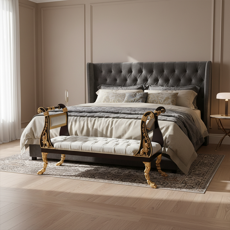 Elevate your master suite with the EKAR Sovereign Imperial Bed End Bench. A masterpiece of English classical design featuring hand-applied gold leaf, mythical sphinx carvings, and premium tufted upholstery. Expertly crafted for global luxury homes by EKAR FURNITURE.