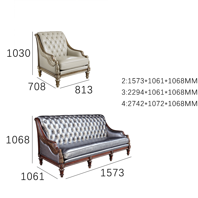 The visual drama of the Sterling Estate Sofa is heightened by its masterful upholstery work. The backrest is adorned with deep, diamond-patterned button tufting, a technique borrowed from the iconic Chesterfield style. This tufting serves a dual purpose: aesthetically, it creates a lush, three-dimensional texture that catches the light and emphasizes the metallic sheen of the material; functionally, it keeps the padding firm and evenly distributed, preventing shifting over time. The upholstery material—a premium high-gloss leather or high-performance faux leather—is smooth to the touch and offers a cool, sleek seating experience. The silver tone acts as a neutral canvas with a twist, capable of reflecting the colors of the surrounding room while maintaining its own distinct character. The seat cushion is designed as a continuous bench-style surface, providing a seamless look that enhances the clean lines of this exquisite piece of living room furniture.