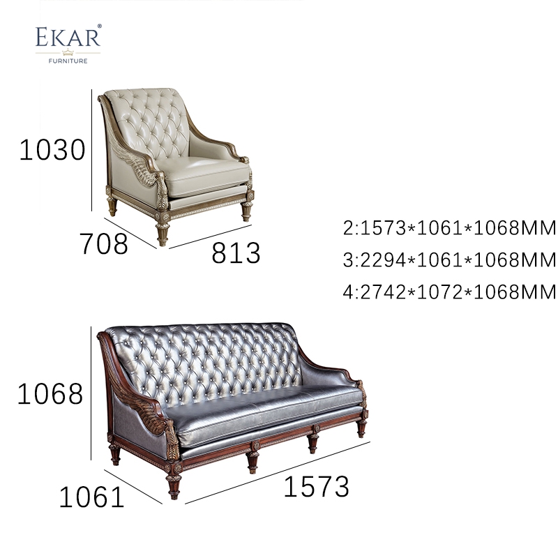 Elevate your formal space with the EKAR Sterling Estate Sofa. Featuring striking metallic silver upholstery, deep button tufting, and a rich handcrafted wood frame, this American-style masterpiece redefines luxury living room furniture.