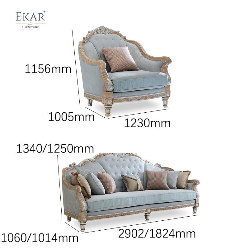 Experience the pinnacle of American classical elegance with the EKAR Versailles Sky-Mist Sofa. Featuring hand-carved solid wood, subtle diamond tufting, and a serene blue-grey damask. Expertly crafted by EKAR FURNITURE, a leading Foshan export furniture factory for global luxury interiors.
