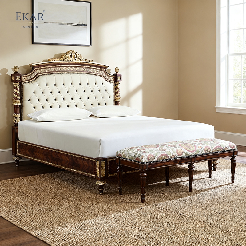 Integrating the EKAR Windsor Bed into your home is about creating a cohesive narrative of luxury. This bed demands a room of generous proportions to fully appreciate its scale. It pairs exceptionally well with matching bedroom furniture such as ornate nightstands with marble tops, a heavy wooden dresser, or a classic armoire. The deep wood tones and gold accents thrive in environments that embrace rich textures—think velvet drapes, Persian rugs, and crystal chandeliers. Whether your interior style leans towards Victorian opulence, Neoclassical grandeur, or a traditional American estate look, the Windsor Bed anchors the design. It sets a standard of elegance that elevates the entire home, proving that true luxury is found in the perfect balance of art, history, and comfort.