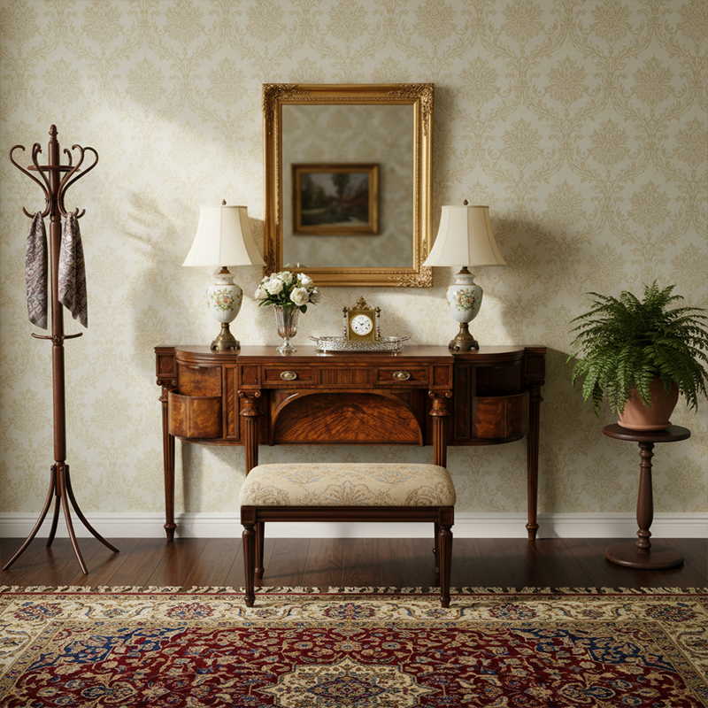 Functionality is masterfully integrated into the regal aesthetic, offering a comprehensive organization solution for an elite household. The console features a multi-compartment configuration, including two central drawers and lateral cupboards, engineered to house everything from personal archives to formal dining accessories. Each drawer operates on a silent, fluid motion preserved by high-performance hardware, while the ornate brass-toned pulls offer a firm grip and a touch of vintage flair. This balance of immense utility and historical grace transforms a piece of formal storage into a vital asset for inclusive hospitality and restorative poise, ensuring your customized furniture remains a functional work of art for decades.